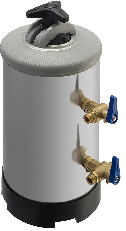 Умягчитель воды содержит в себе синтетическую ионную смолу, которая нейтрализует ионы магния и кальция, а затем заменяет их на ионы натрия. Его конструкция в виде цилиндрического сосуда изготовлена из нержавеющей стали. Он имеет герметичную крышку.