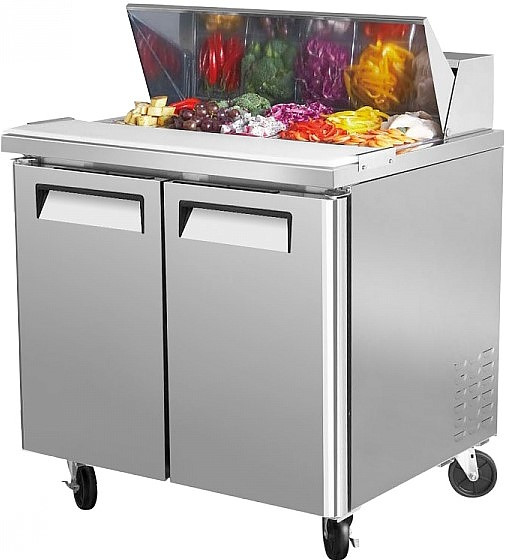 Стол для сбора сэндвичей Turbo air CMST-36 предназначен для кратковременного хранения и нарезки ингредиентов для бургеров и для сборки готовых продуктов на предприятиях общественного питания и торговли. Модель оснащена 2 дверцами с эргономичными ручками, 2 полками и 4 колесами. Корпус выполнен из нержавеющей стали (гальванизированная сталь на оборотной стороне и внизу), уплотнения - из ABS-пластика, пол - из нержавеющей стали с алюминиевыми вставками по бокам и сзади оборудования, регулируемые полки - из толстой стальной проволоки с виниловым покрытием, дверные петли - из высококачественной нержавеющей стали, разделочная доска - из пищевого полиэтилена низкой плотности высокого давления.