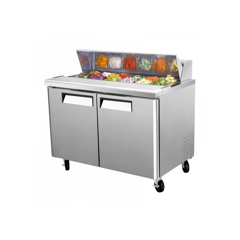 Холодильный стол Turbo Air CMST-48 с крышкой и задним агрегатом используется для приготовления сэндвичей на предприятиях общественного питания и пищевой промышленности. Модель состоит из рабочей поверхности и холодильной камеры. Имеет температурный режим от 0 до +8°С, внутренний объем 340 литров, аналоговое управление, автоматическое размораживание и динамическое охлаждение. Оснащена 2 металлическими дверями и 2 полками. Корпус выполнен из нержавеющей стали, пожаробезопасные стенки толщиной 60 мм уменьшают потребление электроэнергии, магнитные уплотнители имеют цельную конструкцию. Холодильный стол оснащен системой охлаждения гастроемкостей, цифровой системой контроля температуры HTfl и удобной разделочной доской. Фирменные гастроемкости формата GN1/6 входят в комплект поставки.